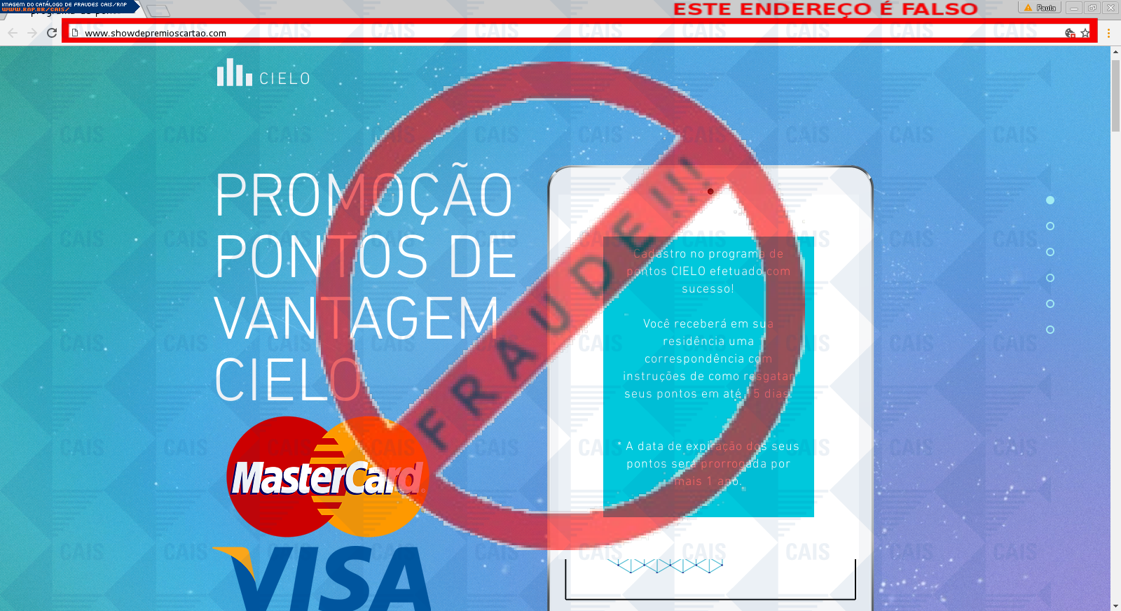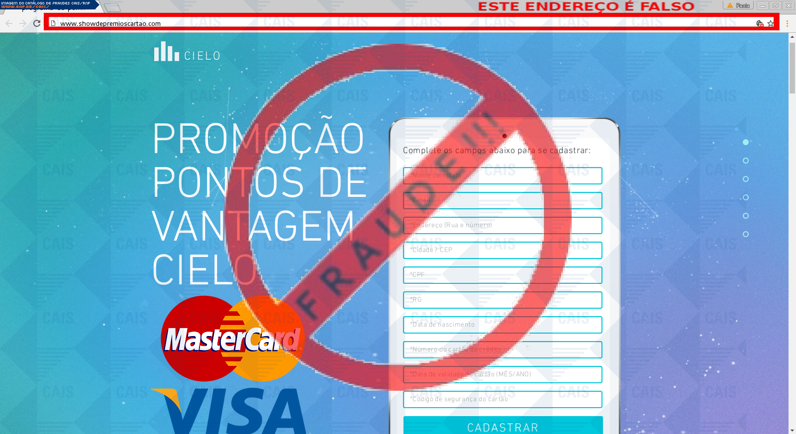 | comentário | A vítima recebe um e-mail informando sobre as vantagens da promoção do cartão Cielo sendo o cadastro através do link disponibilizado, no entanto a página é falsa criada para roubar informações do usuário. | |