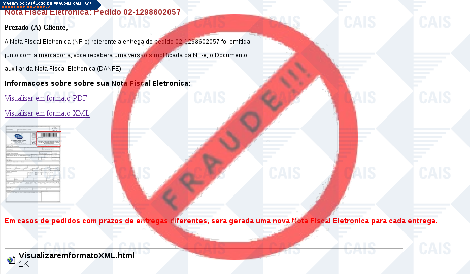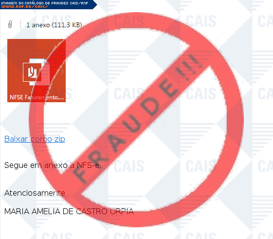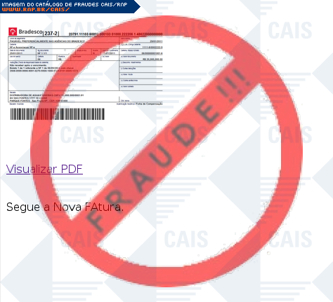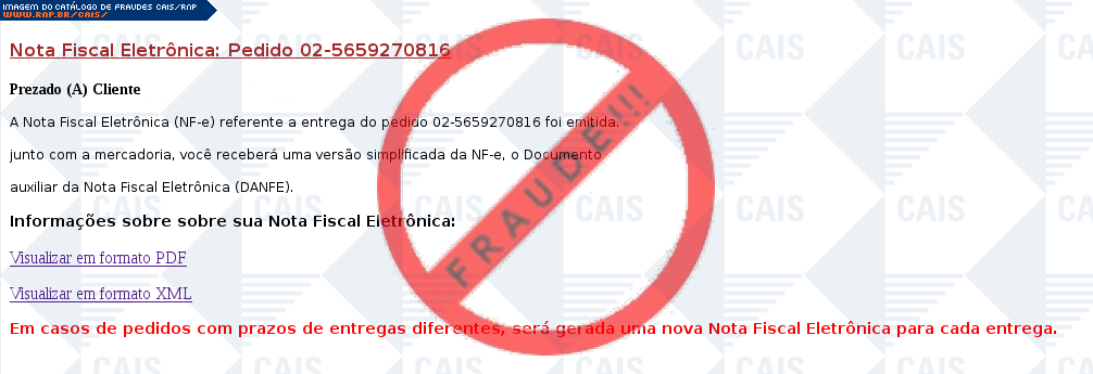 Esta página tem função informativa e educativa. Exibe uma coleção de imagens de phishing scam (fraudes eletrônicas) ou malware (código malicioso) veiculados por meio de spam (e-mail não-solicitado). Trata-se de conteúdo exemplificativo, não exaustivo, uma vez que não é possível contemplar todos os casos de fraudes existentes. Assim, caso você tenha conhecimento de um exemplar que não esteja aqui presente, isto não significa que não seja válido ou real. Inclusive incentivamos que você o envie para análise do CAIS para que, se for o caso, passe a integrar o nosso acervo.