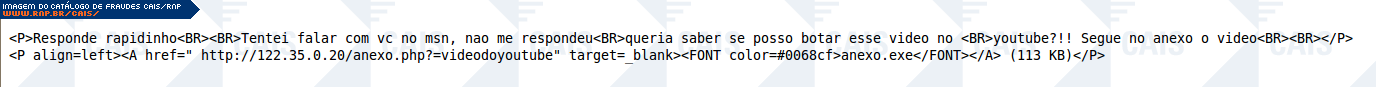 | comentário | Fraude em que um suposto amigo da vítima pede autorização para postar um vídeo no youtube. O link para o vídeo leva a um software malicioso que foi identificado como Generic.Banker.OT.17F0D621 (BitDefender). | |
