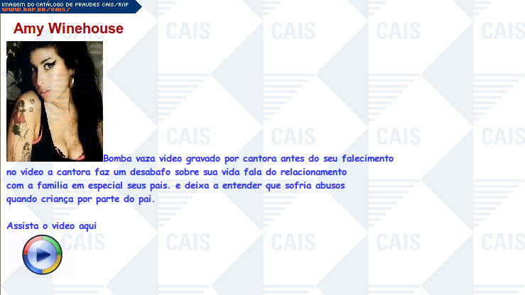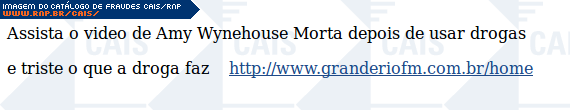 | comentário | A mensagem contém um link para um vídeo com imagens de Amy Wynehouse 10 minutos depois de morta. O conteúdo malicioso não estava disponível no momento da análise. | |