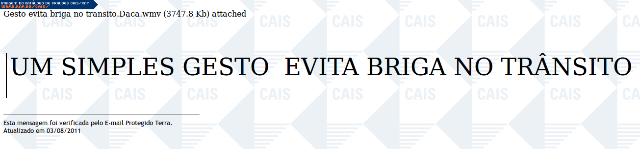 | comentário | A mensagem contém um link para um suposto vídeo sobre uma suposta briga de trânsito que foi interrompida. O conteúdo malicioso não estava disponível no momento da análise. | |