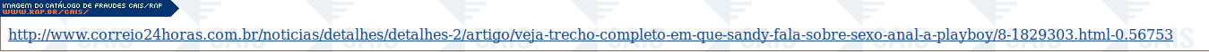| comentário | A mensagem contém um link para o vídeo da entrevista da cantora Sandy para a revista Playboy. O link leva ao arquivo malicioso que foi identificado como Trojan-Banker.BAT.Qhost.ak (Kaspersky). | |