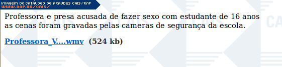 | comentário | A fraude contém um link para uma suposta notícia do portal folha.com sobre um vídeo com cenas de sexo entre um professor e uma aluna da 5° série. O conteúdo malicioso não estava mais disponível no momento da análise. | |