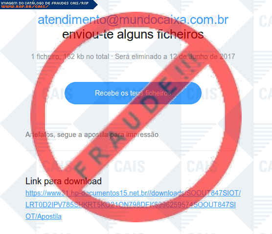 Esta página tem função informativa e educativa. Exibe uma coleção de imagens de phishing scam (fraudes eletrônicas) ou malware (código malicioso) veiculados por meio de spam (e-mail não-solicitado). Trata-se de conteúdo exemplificativo, não exaustivo, uma vez que não é possível contemplar todos os casos de fraudes existentes. Assim, caso você tenha conhecimento de um exemplar que não esteja aqui presente, isto não significa que não seja válido ou real. Inclusive incentivamos que você o envie para análise do CAIS para que, se for o caso, passe a integrar o nosso acervo.