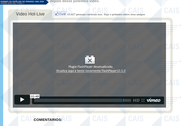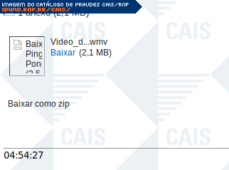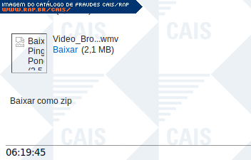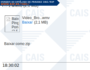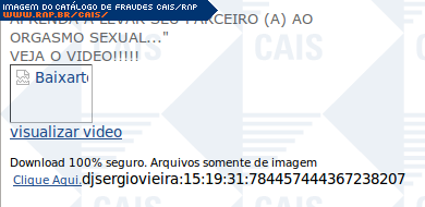 | comentário | Vídeo tenta induzir a vítima ao download de um suposto vídeo, que na verdade trata-se de um malware identificado como: Gen:Variant.Graftor.11220(Bit Defender). | |