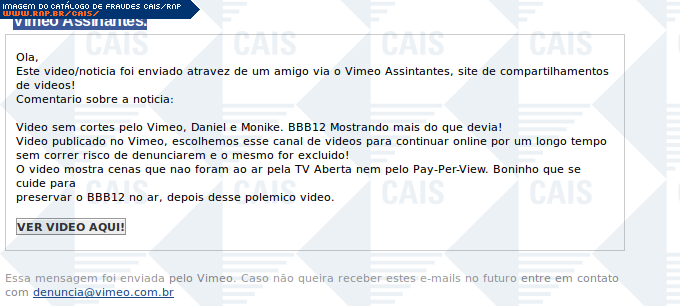 | comentário | A fraude contém um link para um suposto vídeo do Big Brother Brasil. O conteúdo maliicoso não estava disponível no momento da análise. | |