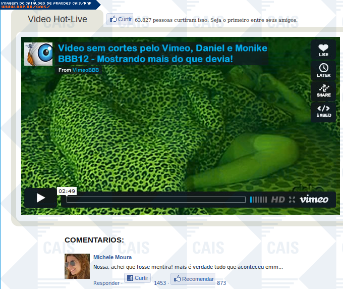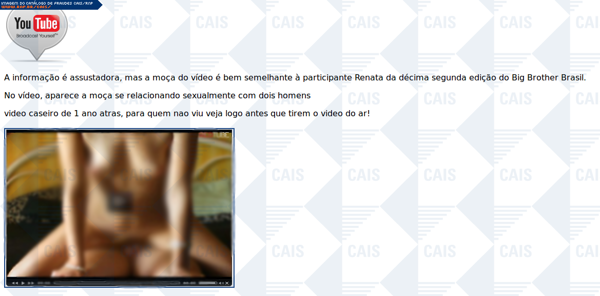 | comentário | A fraude contém um link para um suposto vídeo de sexo com uma participante do programa. O link leva ao download do arquivo malicioso que foi identificado como Gen:Variant.Zusy.750 (BitDefender). | |