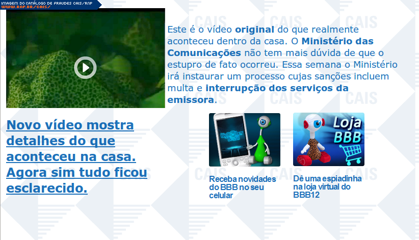 | comentário | A fraude contém um suposto vídeos com cenas, sem cortes, do Big Brother. O conteúdo malicioso não estava disponível no momento da análise. | |