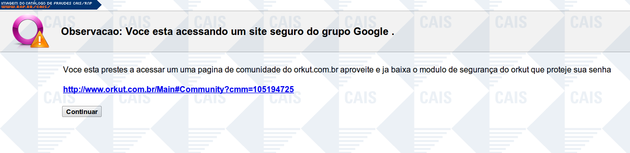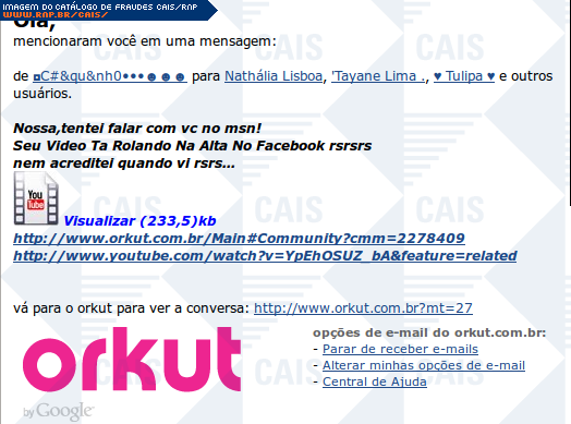 | comentário | A fraude se passa pela mensagem de um amigo no Orkut informando sobre uma vídeo da vítima que está sendo divulgado no Facebook. O link para o suposto vídeo leva ao arquivo malicioso que foi identificado como Trojan.Delf.Inject.Z (BitDefender). | |