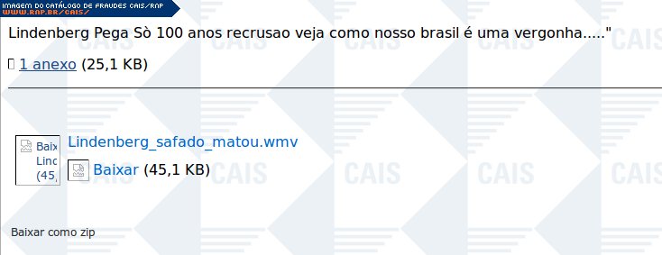 | comentário | A fraude contém um link para um vídeo sobre o julgamento de Lindemberg. O conteúdo malicioso não estava disponível no momento da análise. | |