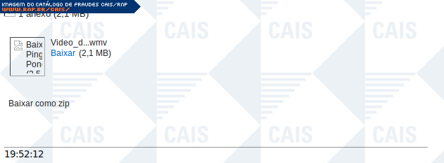 | comentário | Mensagem disponibiliza um suposto vídeo para download. Contudo, tal vídeo trata-se de um malware identificado como Gen:Variant.Graftor.11220 (bit Defender). | |