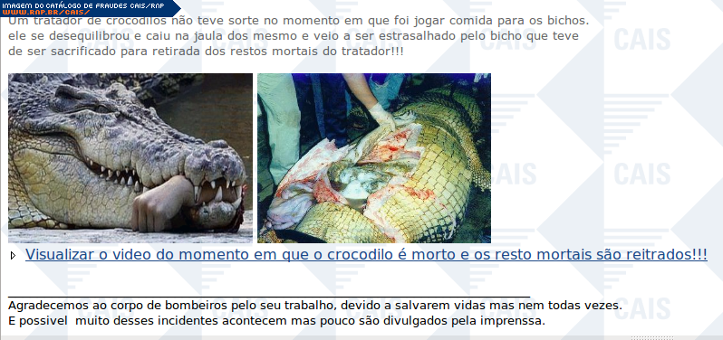 | comentário | A fraude contém um link para um suposto vídeo com imagens de um tratador que foi atacado por um crocodilo. O link leva ao arquivo malicioso que foi identificado como Gen:Variant.Zusy.1099 (BitDefender). | |