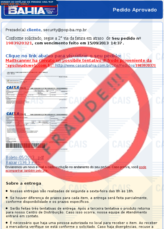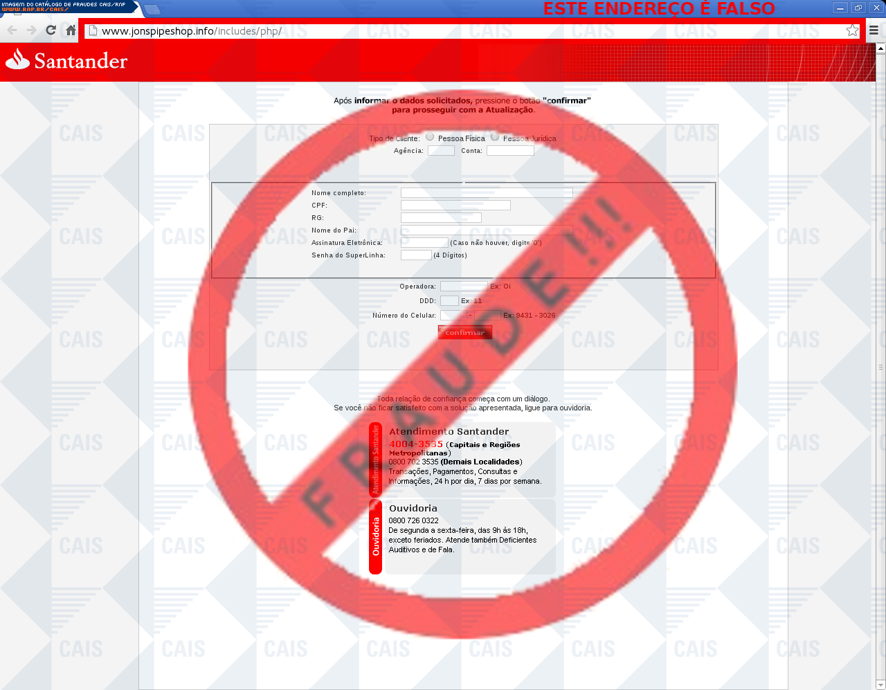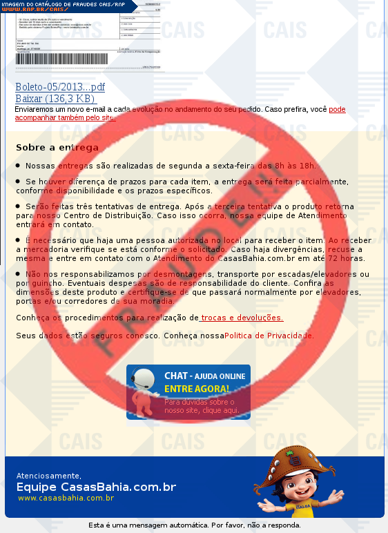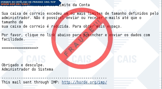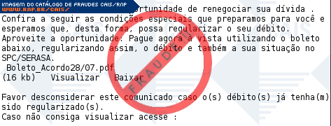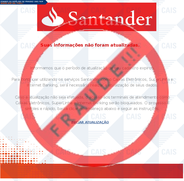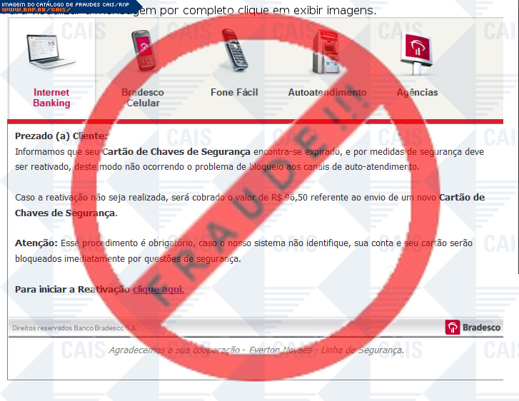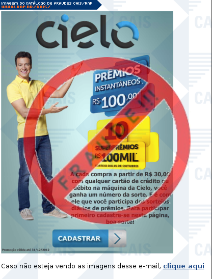 Esta página tem função informativa e educativa. Exibe uma coleção de imagens de phishing scam (fraudes eletrônicas) ou malware (código malicioso) veiculados por meio de spam (e-mail não-solicitado). Trata-se de conteúdo exemplificativo, não exaustivo, uma vez que não é possível contemplar todos os casos de fraudes existentes. Assim, caso você tenha conhecimento de um exemplar que não esteja aqui presente, isto não significa que não seja válido ou real. Inclusive incentivamos que você o envie para análise do CAIS para que, se for o caso, passe a integrar o nosso acervo.