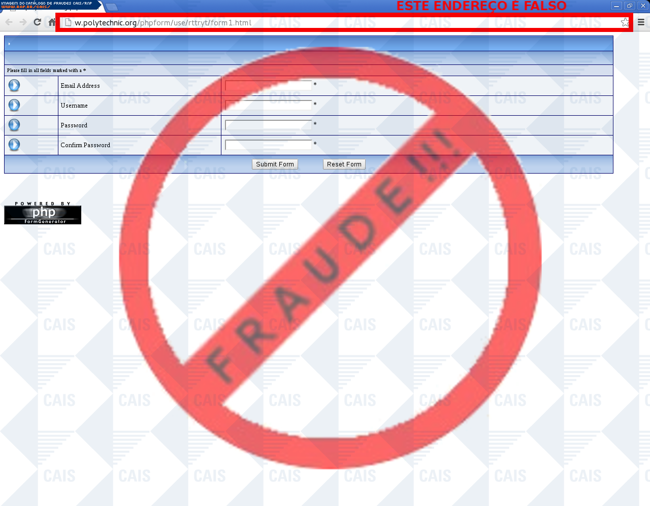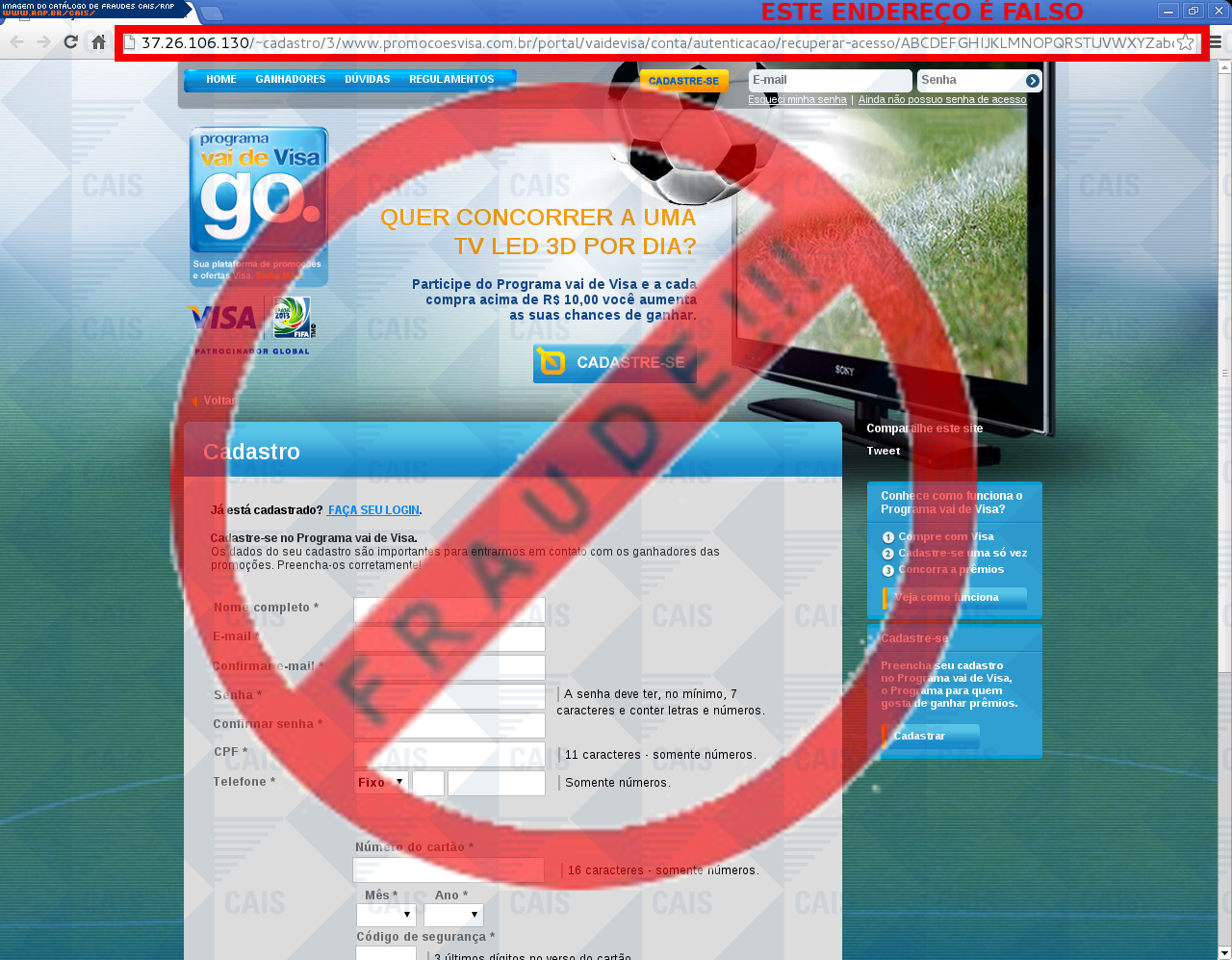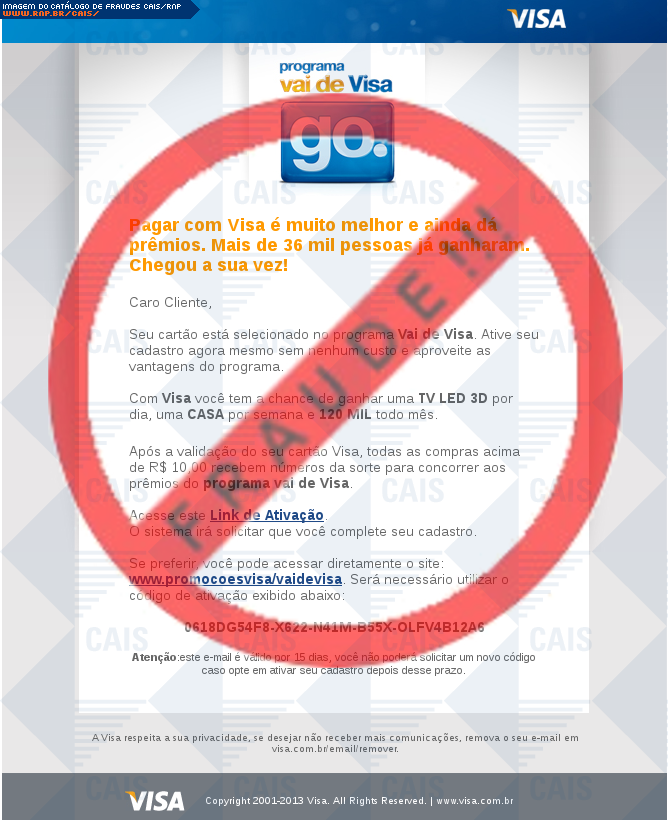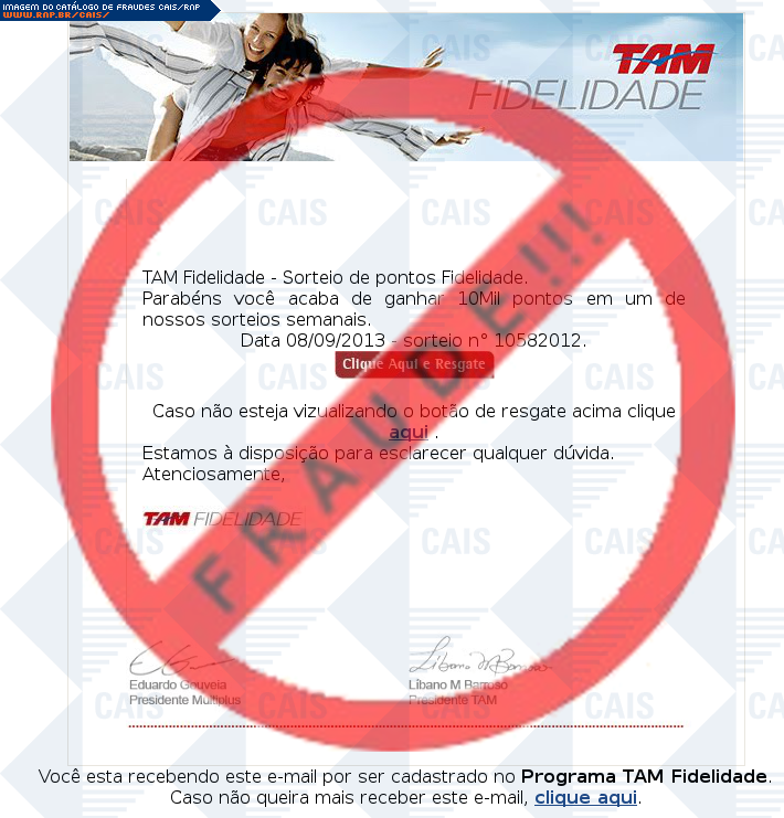 Esta página tem função informativa e educativa. Exibe uma coleção de imagens de phishing scam (fraudes eletrônicas) ou malware (código malicioso) veiculados por meio de spam (e-mail não-solicitado). Trata-se de conteúdo exemplificativo, não exaustivo, uma vez que não é possível contemplar todos os casos de fraudes existentes. Assim, caso você tenha conhecimento de um exemplar que não esteja aqui presente, isto não significa que não seja válido ou real. Inclusive incentivamos que você o envie para análise do CAIS para que, se for o caso, passe a integrar o nosso acervo.