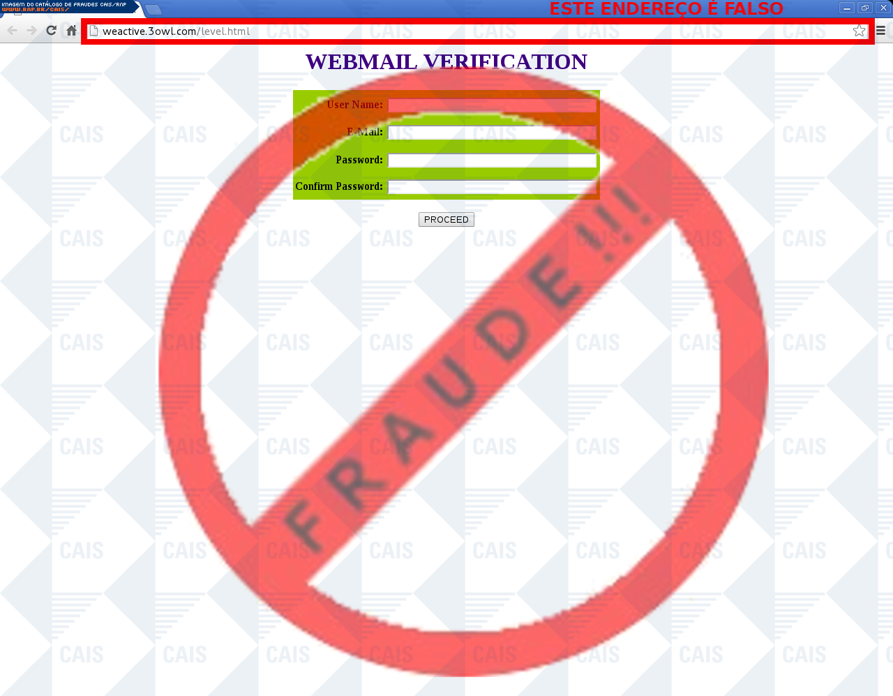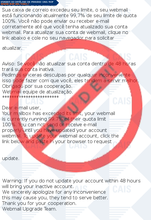 | comentário | Uma mensagem é enviada solicitando que o usuário atualize a sua conta de e-mail para continuar enviando e recebendo mensagens, mas o link disponibilizado leva-o a uma pagina falsa que solicita usuário e senha do mesmo. | |