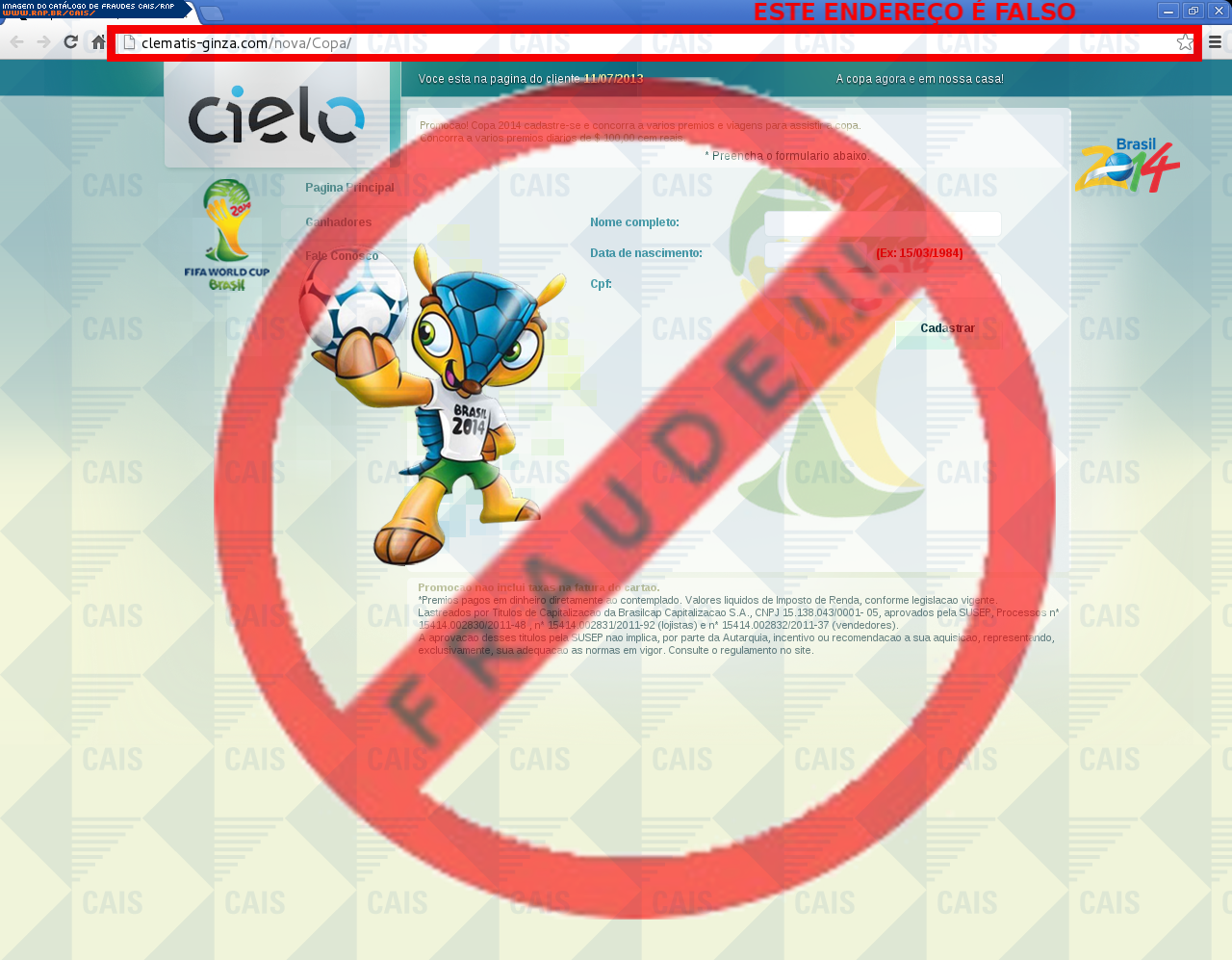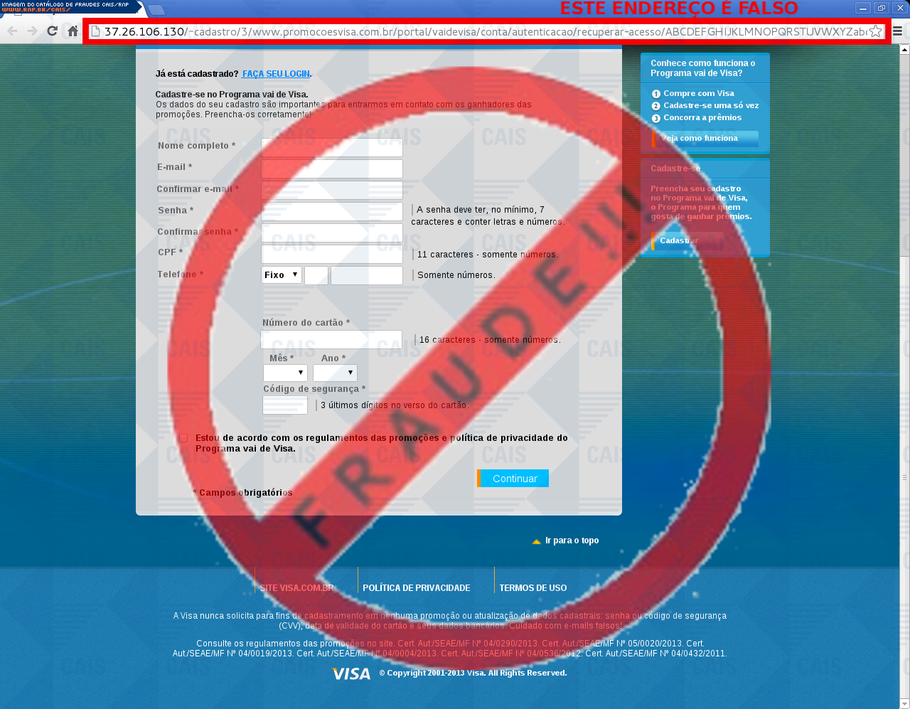 | comentário | O usuário recebe uma mensagem de promoção, mas quando acessado o link para cadastro é aberta uma pagina falsa usada na pratica de phishing, solicitando inclusive dados do cartão de credito do usuário. | |