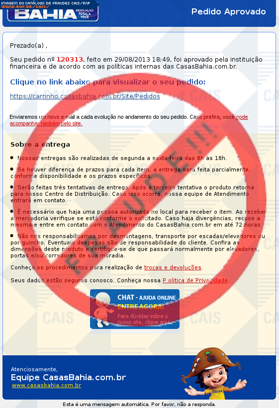 | assunto | Casas Bahia Compra Aprovada Seu pedido esta sendo separado 30/08/2013 05:55:44 | |