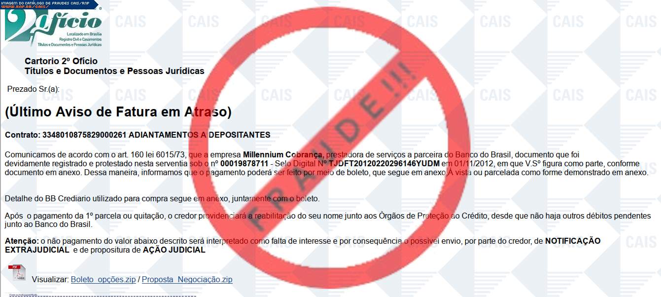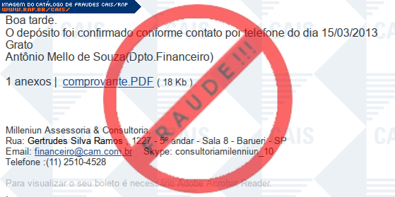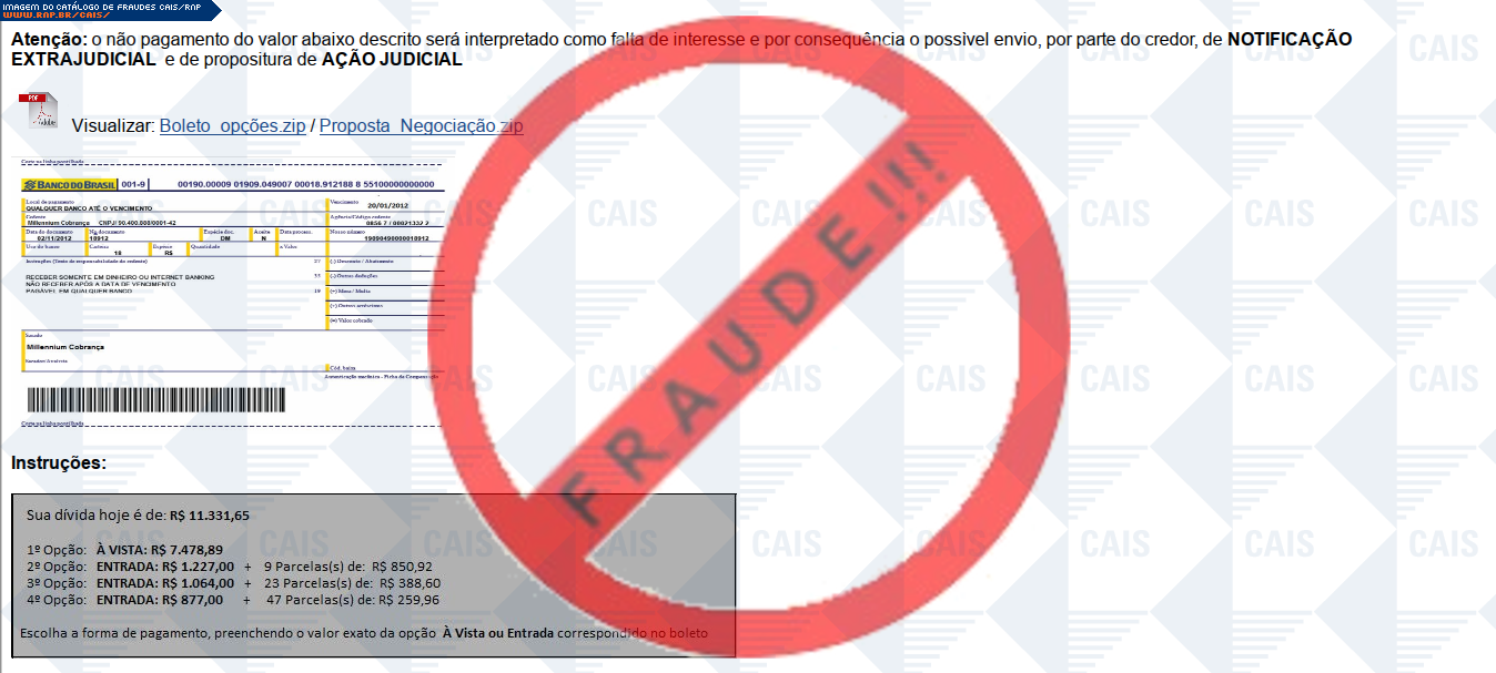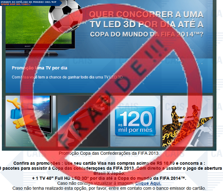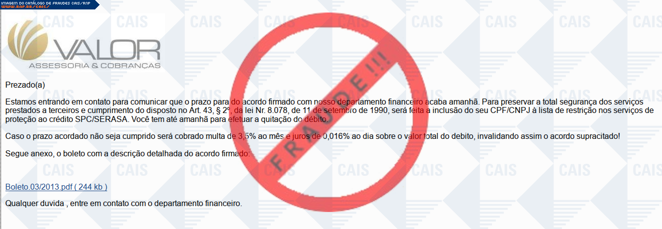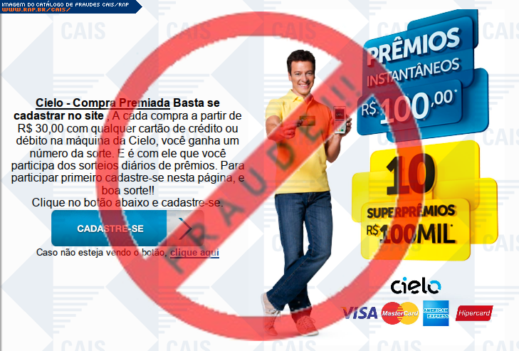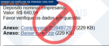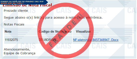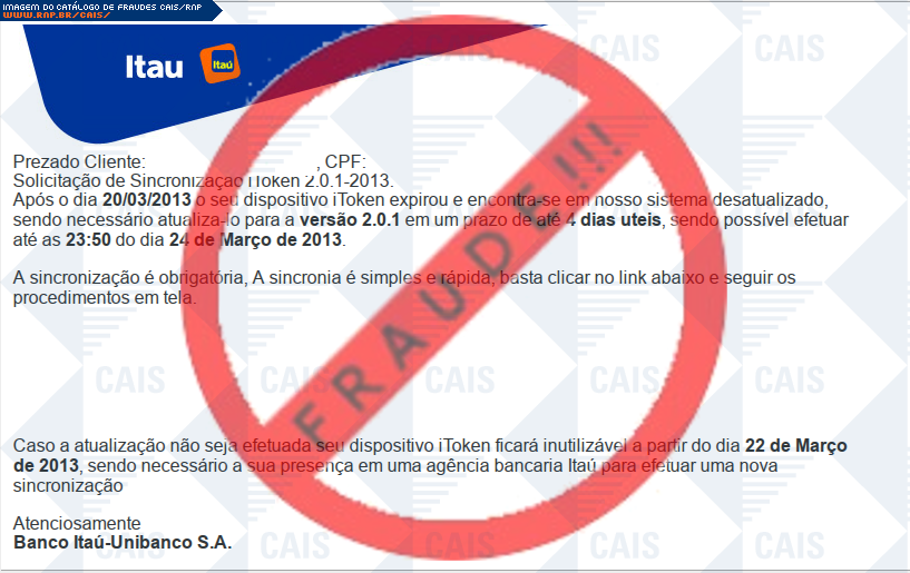 Esta página tem função informativa e educativa. Exibe uma coleção de imagens de phishing scam (fraudes eletrônicas) ou malware (código malicioso) veiculados por meio de spam (e-mail não-solicitado). Trata-se de conteúdo exemplificativo, não exaustivo, uma vez que não é possível contemplar todos os casos de fraudes existentes. Assim, caso você tenha conhecimento de um exemplar que não esteja aqui presente, isto não significa que não seja válido ou real. Inclusive incentivamos que você o envie para análise do CAIS para que, se for o caso, passe a integrar o nosso acervo.