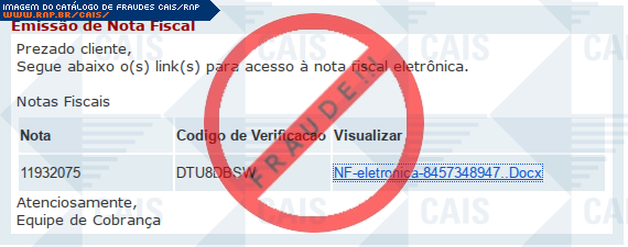 | comentário | Malware: O fraudador encaminha um email contendo uma suposta nota fiscal, mas trata-se de um link para download de um malware. | |