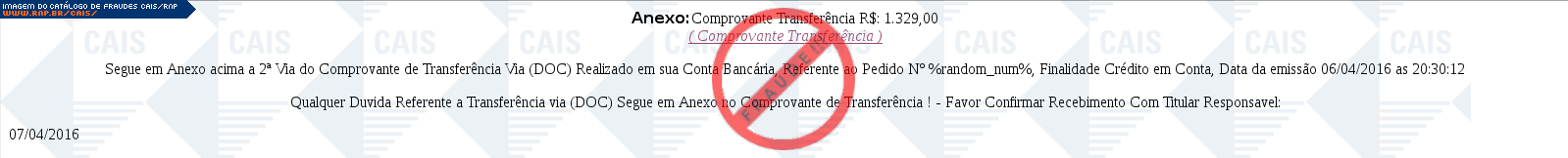 | comentário | O usuário recebe uma mensagem contendo um comprovante disponível para download, no entanto o arquivo originado é malicioso criado para roubar informações da vítima e instalar outros arquivos fraudulentos com o nome de Generic.XPL.ADODB.3502BBC5. | |