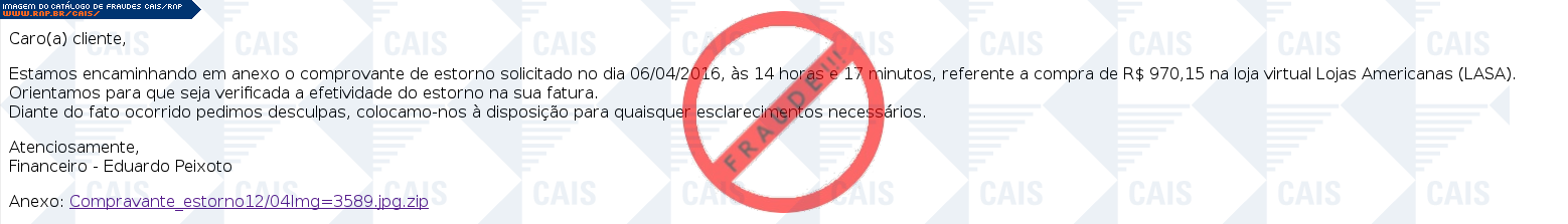 Esta página tem função informativa e educativa. Exibe uma coleção de imagens de phishing scam (fraudes eletrônicas) ou malware (código malicioso) veiculados por meio de spam (e-mail não-solicitado). Trata-se de conteúdo exemplificativo, não exaustivo, uma vez que não é possível contemplar todos os casos de fraudes existentes. Assim, caso você tenha conhecimento de um exemplar que não esteja aqui presente, isto não significa que não seja válido ou real. Inclusive incentivamos que você o envie para análise do CAIS para que, se for o caso, passe a integrar o nosso acervo.