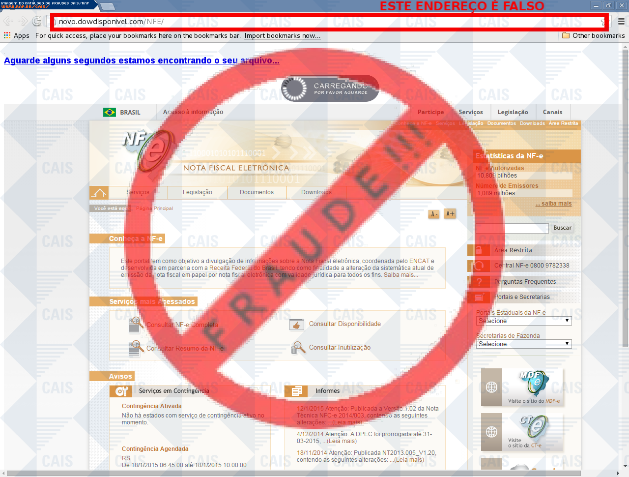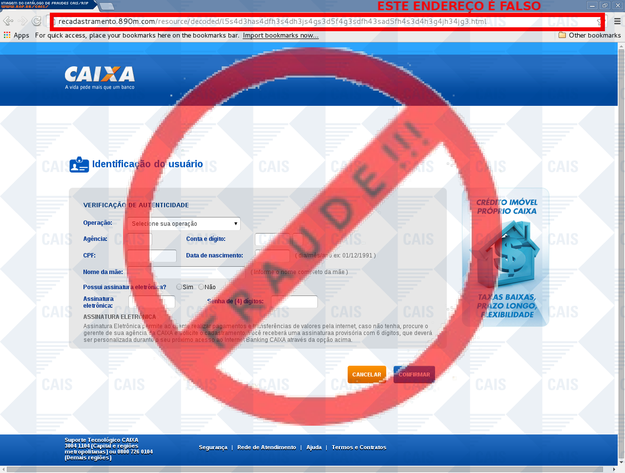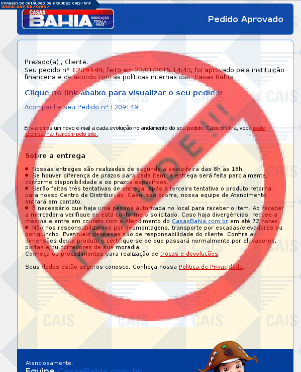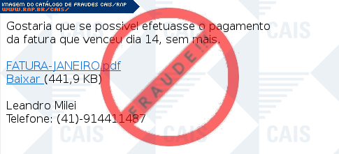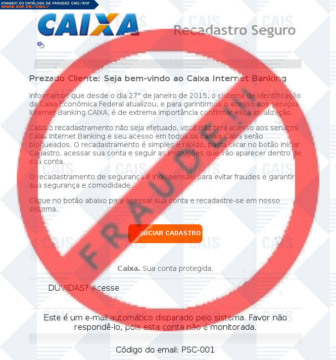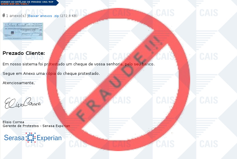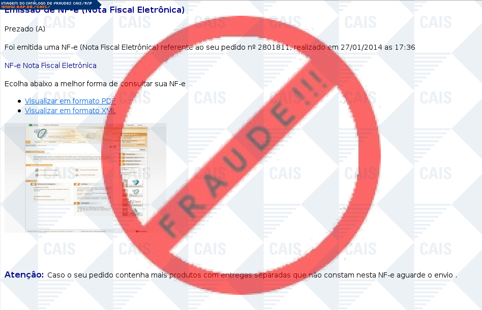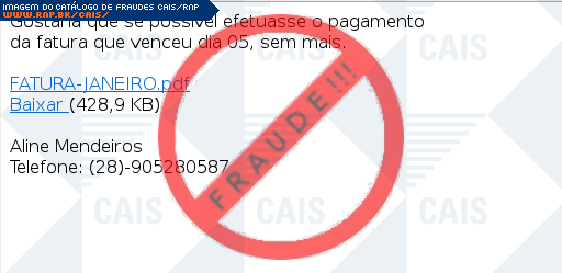 Esta página tem função informativa e educativa. Exibe uma coleção de imagens de phishing scam (fraudes eletrônicas) ou malware (código malicioso) veiculados por meio de spam (e-mail não-solicitado). Trata-se de conteúdo exemplificativo, não exaustivo, uma vez que não é possível contemplar todos os casos de fraudes existentes. Assim, caso você tenha conhecimento de um exemplar que não esteja aqui presente, isto não significa que não seja válido ou real. Inclusive incentivamos que você o envie para análise do CAIS para que, se for o caso, passe a integrar o nosso acervo.