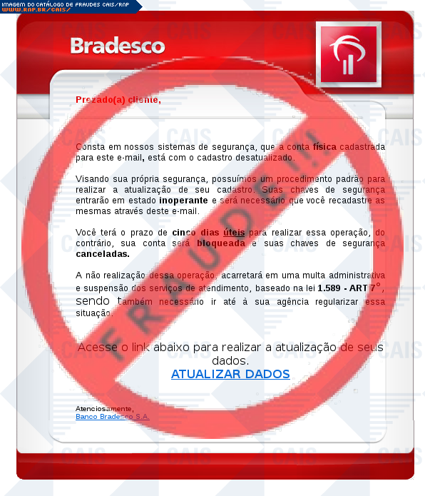 | comentário | O usuário recebe um e-mail informando que sua chave de segurança da conta do banco Bradesco expirou sendo necessário realizar uma atualização no link disponibilizado, entretanto a página fornecida é falsa criada para roubar os dados bancários da vítima. | |