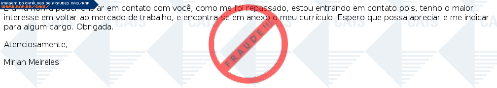 | comentário | O usuário recebe uma mensagem contendo um currículo disponível para download, no entanto o arquivo originado é malicioso criado para roubar informações da vítima e instalar outros arquivos fraudulentos com o nome de Gen:Variant.Renos.96. | |