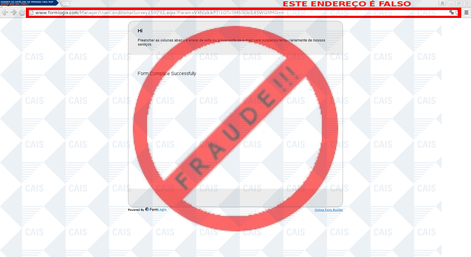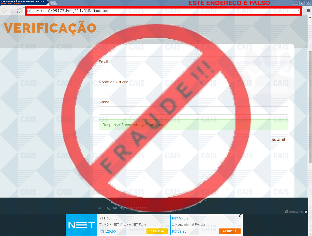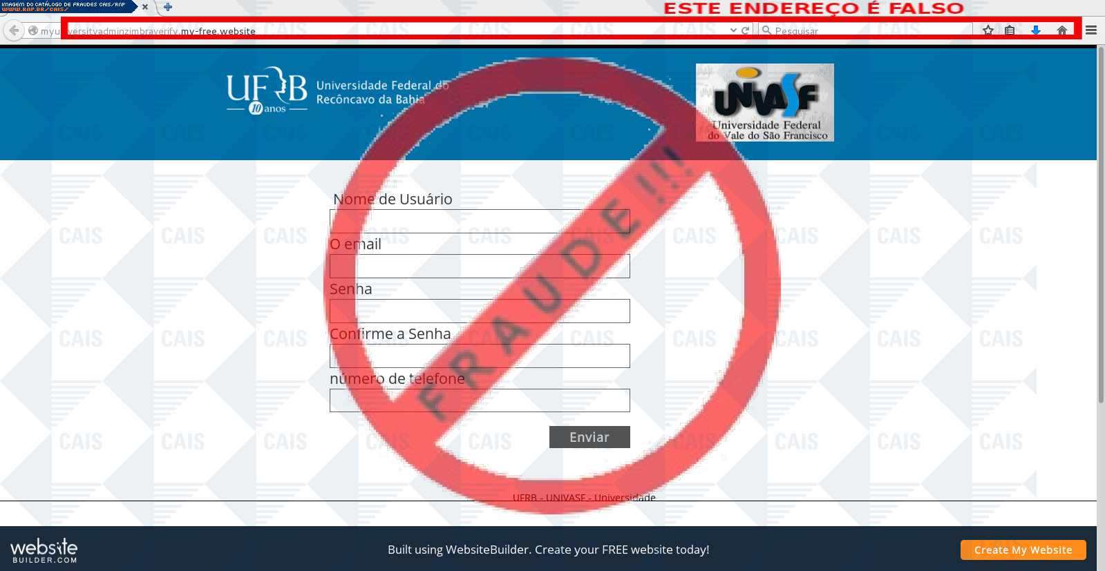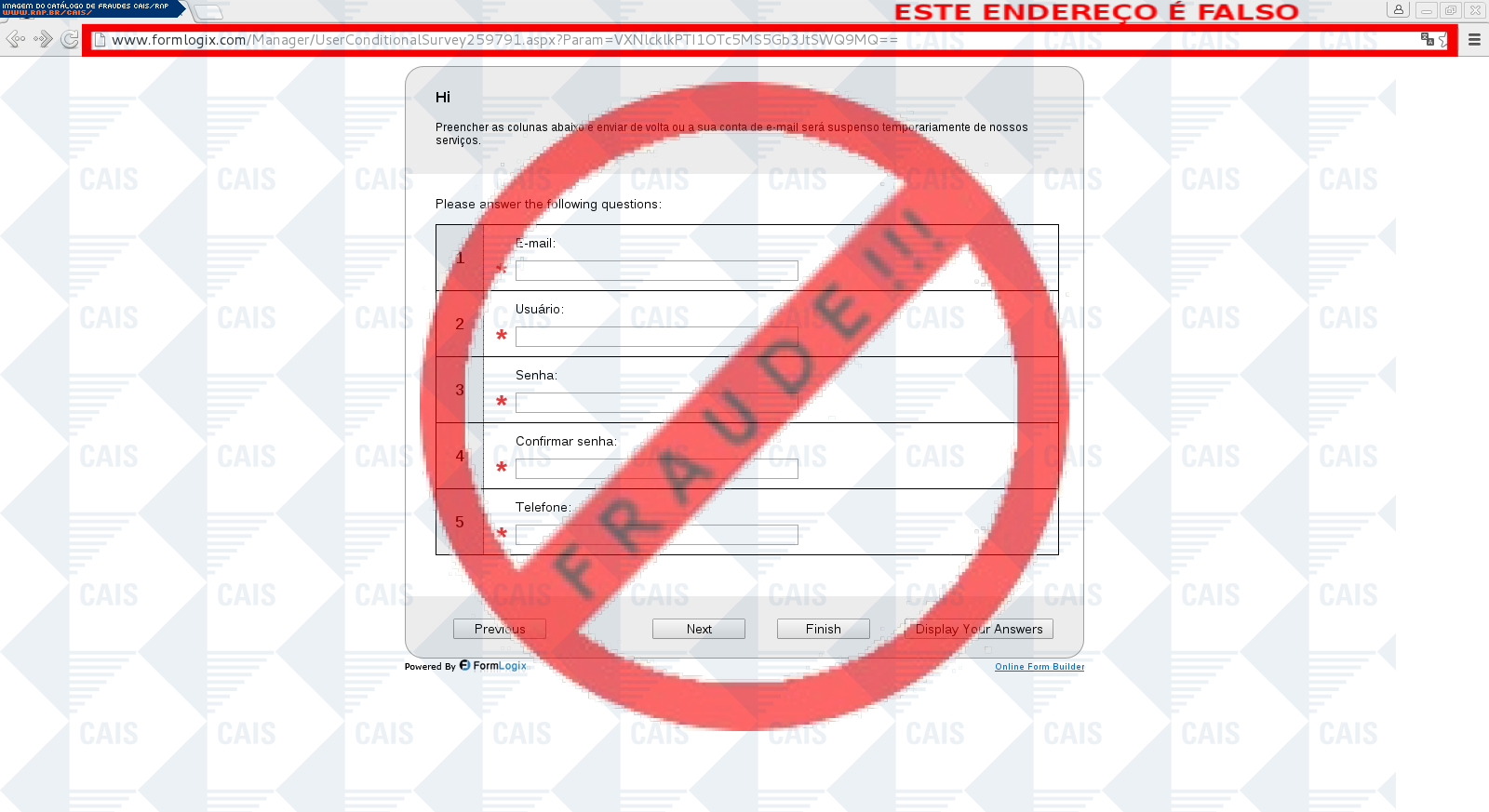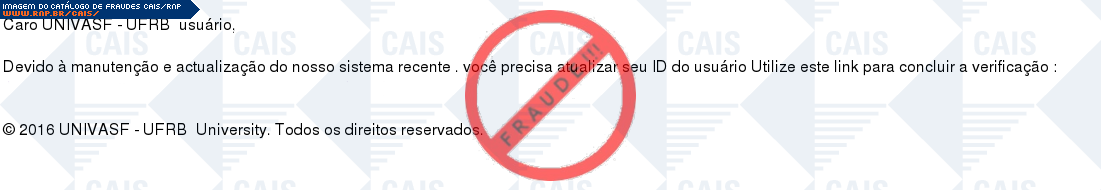Esta página tem função informativa e educativa. Exibe uma coleção de imagens de phishing scam (fraudes eletrônicas) ou malware (código malicioso) veiculados por meio de spam (e-mail não-solicitado). Trata-se de conteúdo exemplificativo, não exaustivo, uma vez que não é possível contemplar todos os casos de fraudes existentes. Assim, caso você tenha conhecimento de um exemplar que não esteja aqui presente, isto não significa que não seja válido ou real. Inclusive incentivamos que você o envie para análise do CAIS para que, se for o caso, passe a integrar o nosso acervo.