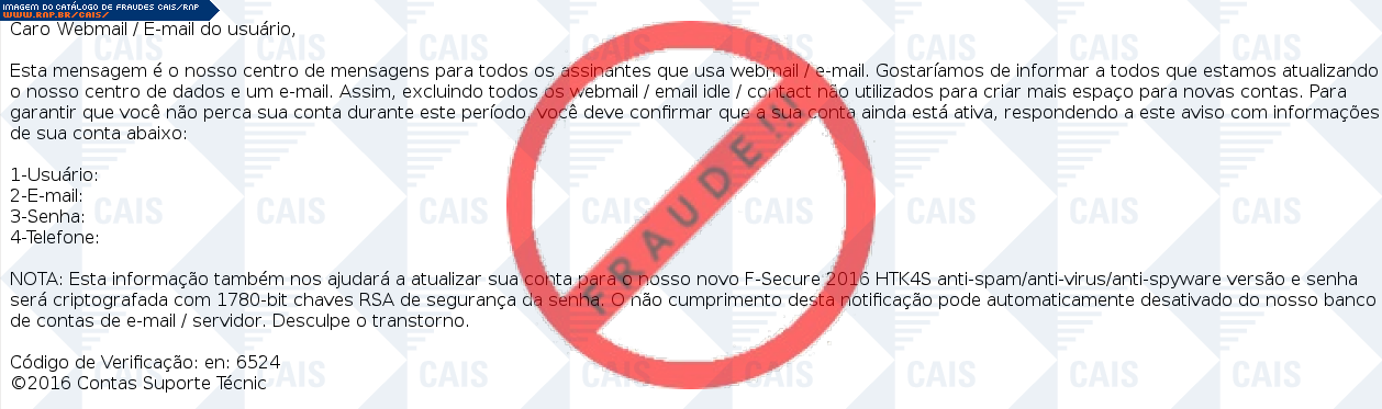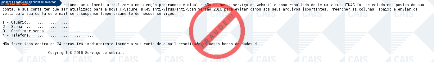 | tipo | FRAUDE - Webmail atualização antivírus | ID: 45116 |