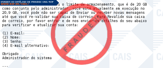 | comentário | O usuário recebe uma mensagem informando que a capacidade de armazenamento de sua conta de e-mail atingiu o limite sendo necessário responder o e-mail com algumas informações, no entanto o e-mail é falso criado para roubar os dados de login da vítima. | |