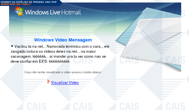 | comentário | Mensagem que se auto intitula como uma "Windows Video Mensagem", possuindo um link para supostos vídeos íntimos de ex-namorados. Segundo o email, o sujeito, zangado por ter levado um fora da namorada, disponibiliza seus vídeos na internet. O arquivo malicioso... (leia mais) | |