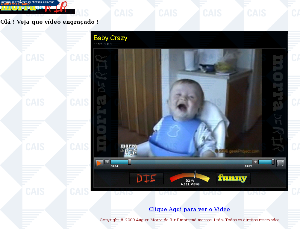 | comentário | E-mail que induz a vítima a clicar em uma imagem que supostamente a mostraria um vídeo de um bebê, mas que na verdade redireciona para o download de um executável chamado risada.exe, que não estava disponível no momento da análise. | |