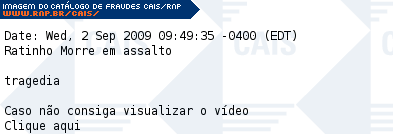 | comentário | Fraude que supostamente teria um link para o vídeo de assalto do Ratinho, que teria envolvido a sua morte. Na verdade o link aponta para o arquivo malicioso classificado pelo AntiVir como sendo TR/ATRAPS.Gen. | |