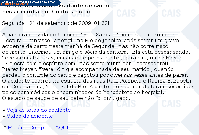 | comentário | Fraude que informa sobre um suposto acidente sofrido pela cantora Ivete Sangalo, no qual ela estava dirigindo um carro quando perdeu o controle e capotou. O software maicioso não foi encontrado. | |
