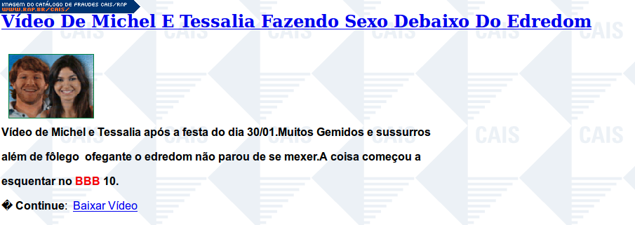 | comentário | Mensagem falando sobre suposto vídeo de sexo entre participantes do Big Brother Brasil 10. Um link fornecido que levaria ao vídeo direciona a vítima para conteúdo malicioso não disponível no momento da análise. obs.: As imagens da fraude não estavam acessíveis... (leia mais) | |