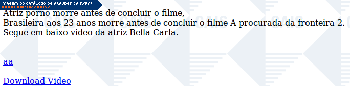 | comentário | Mensagem noticiando suposta morte de atriz brasileira pornô de 23 anos, de nome Bella Carla, antes de concluir um filme. Um link na fraude que seria para um vídeo da atriz direciona a vítima para conteúdo malicioso não disponível no momento da análise. | |