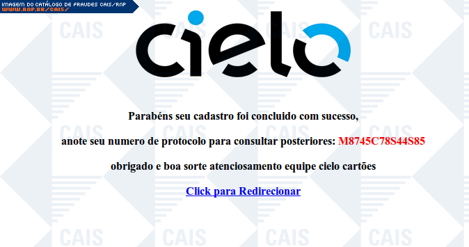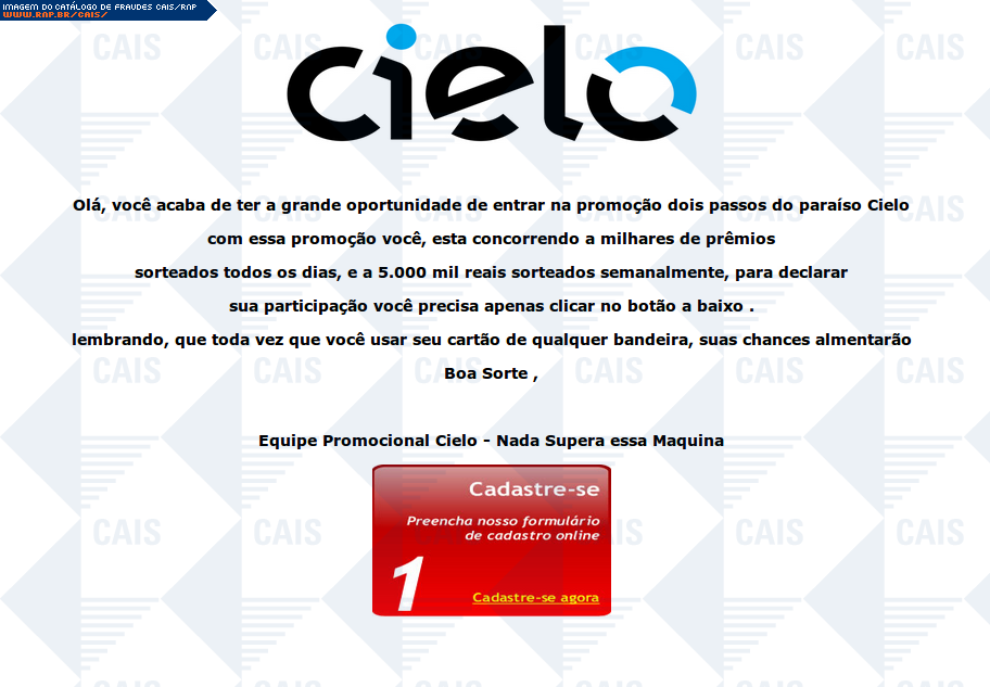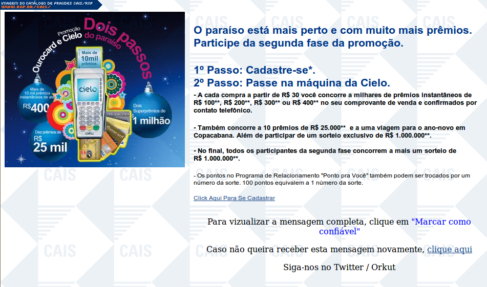 | comentário | Mensagem anunciando a promoção Dois passos do Paraíso da empresa Cielo. A mensagem contém um link para que a vítima se cadastre na promoção. O link leva a um site falsa destinado a roubar dados confidenciais da vítima. | |
