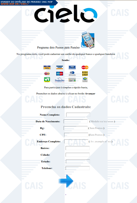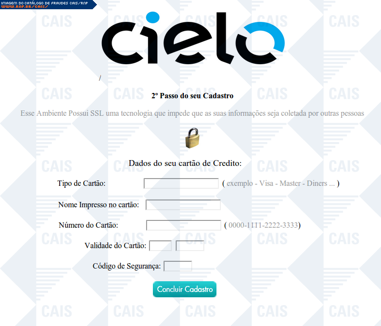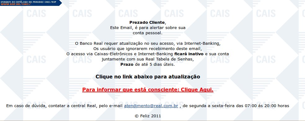 Esta página tem função informativa e educativa. Exibe uma coleção de imagens de phishing scam (fraudes eletrônicas) ou malware (código malicioso) veiculados por meio de spam (e-mail não-solicitado). Trata-se de conteúdo exemplificativo, não exaustivo, uma vez que não é possível contemplar todos os casos de fraudes existentes. Assim, caso você tenha conhecimento de um exemplar que não esteja aqui presente, isto não significa que não seja válido ou real. Inclusive incentivamos que você o envie para análise do CAIS para que, se for o caso, passe a integrar o nosso acervo.