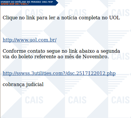 | comentário | O assunto da mensagem indica ser sobre o envio de notícias do site UOL. A mensagem contém um link para o site verdadeiro do UOL e um link para a segunda via de um suposto boleto. O link leva a um arquivo malicioso que foi identificado como Trojan-Downloader.Win32.Agent.foep... (leia mais) | |