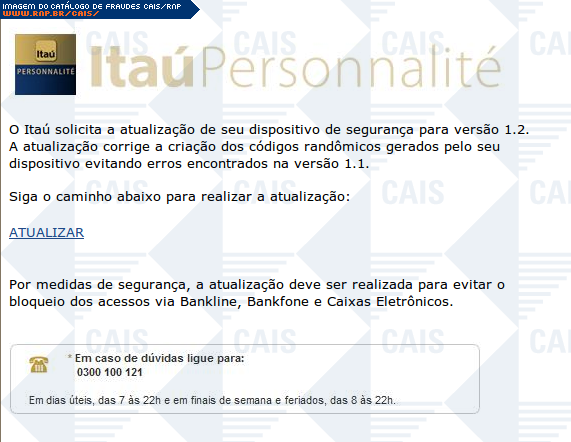 | comentário | Mensagem falsa que usa o nome do banco Itaú pra solicitar a atualização de um dispositivo de segurança. A fraude possui um link que leva ao malware Trojan.Generic.KDV.101200 (BitDefender). | |