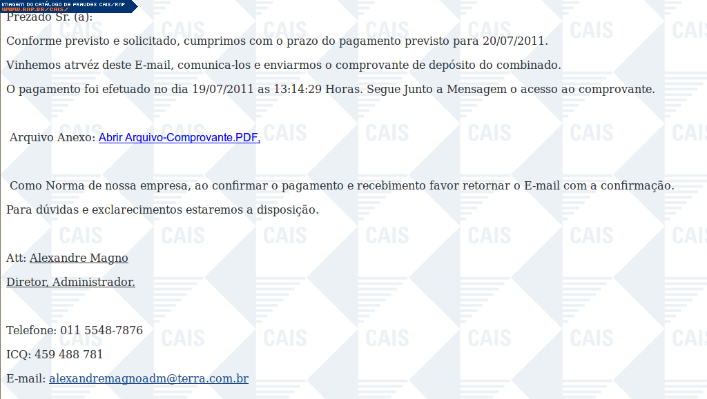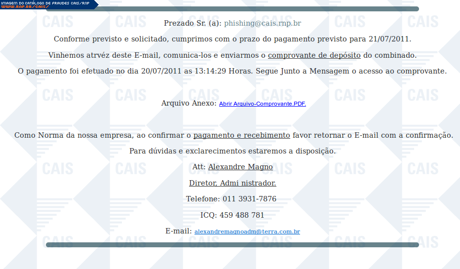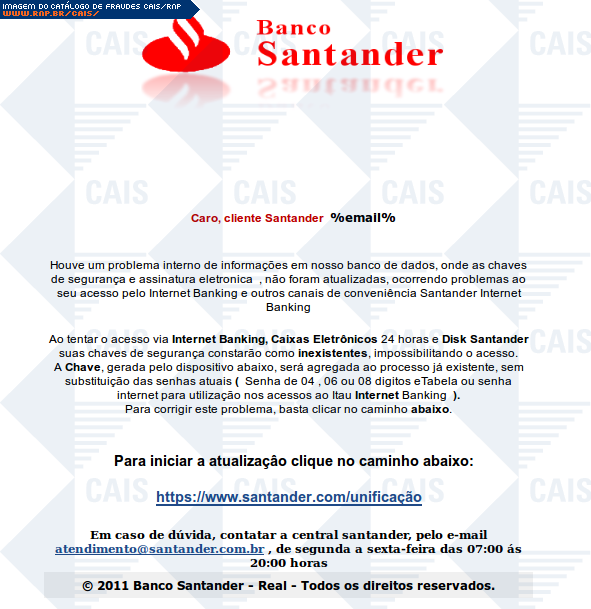 Esta página tem função informativa e educativa. Exibe uma coleção de imagens de phishing scam (fraudes eletrônicas) ou malware (código malicioso) veiculados por meio de spam (e-mail não-solicitado). Trata-se de conteúdo exemplificativo, não exaustivo, uma vez que não é possível contemplar todos os casos de fraudes existentes. Assim, caso você tenha conhecimento de um exemplar que não esteja aqui presente, isto não significa que não seja válido ou real. Inclusive incentivamos que você o envie para análise do CAIS para que, se for o caso, passe a integrar o nosso acervo.