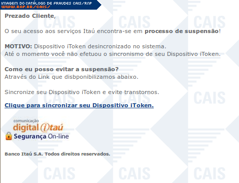 | comentário | Comunicado falso do banco Itaú informando que a vítima teve seu acesso aos serviços do banco suspenso. A mensagem fornece um link para que a vítima sincronize o dispositivo iToken. O conteúdo malicioso não estava disponível no momento da análise. | |