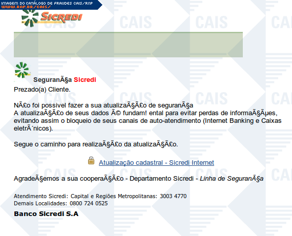 | comentário | Mensagem falsa do banco Sicredi pedindo que a vítima realize a atualização de seus dados através de um link. O conteúdo malicioso já havia sido removido no momento da análise. | |