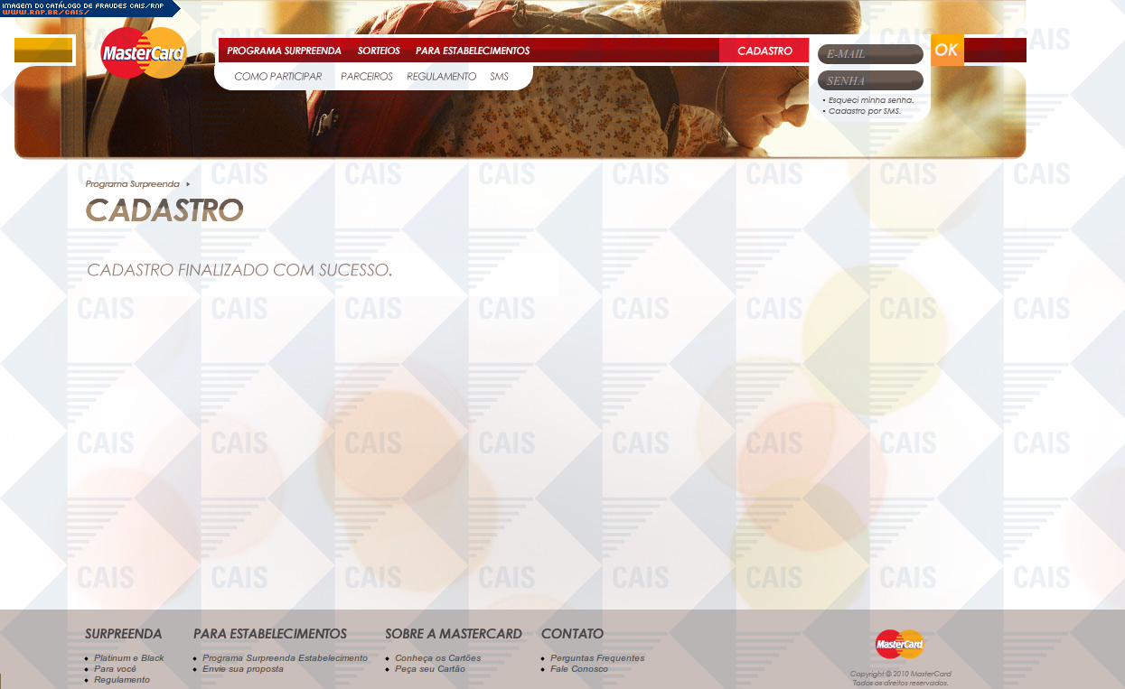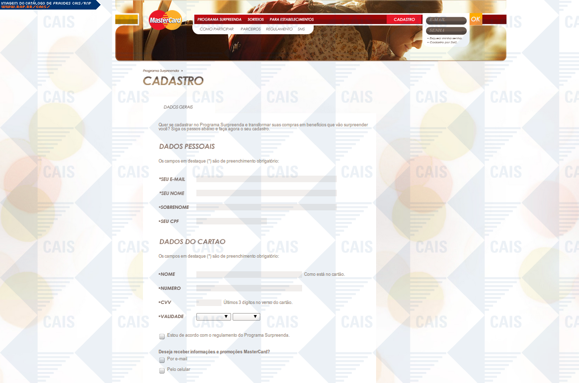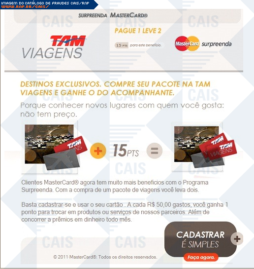 | comentário | A mensagem em nome das empresas TAM e Mastercard fornece um link para o cadastro em uma suposta promoção. O link leva a uma página falsa destinada a coletar dados do cartão de crédito da vitima. | |