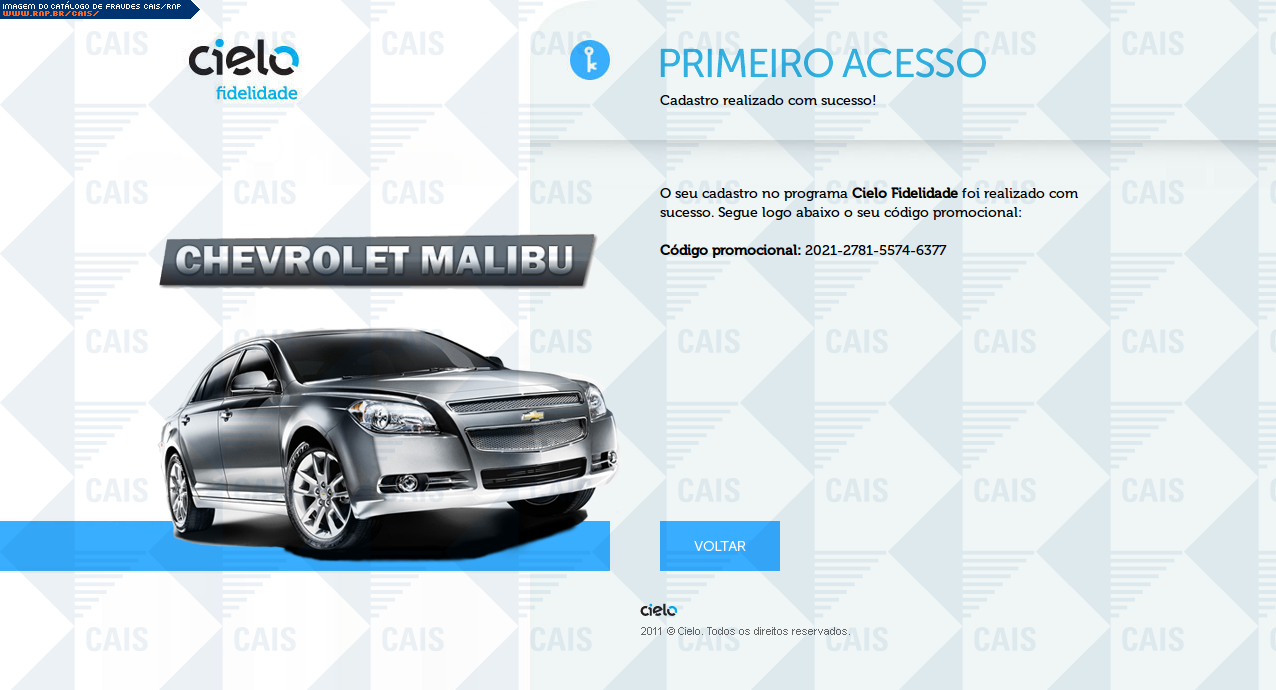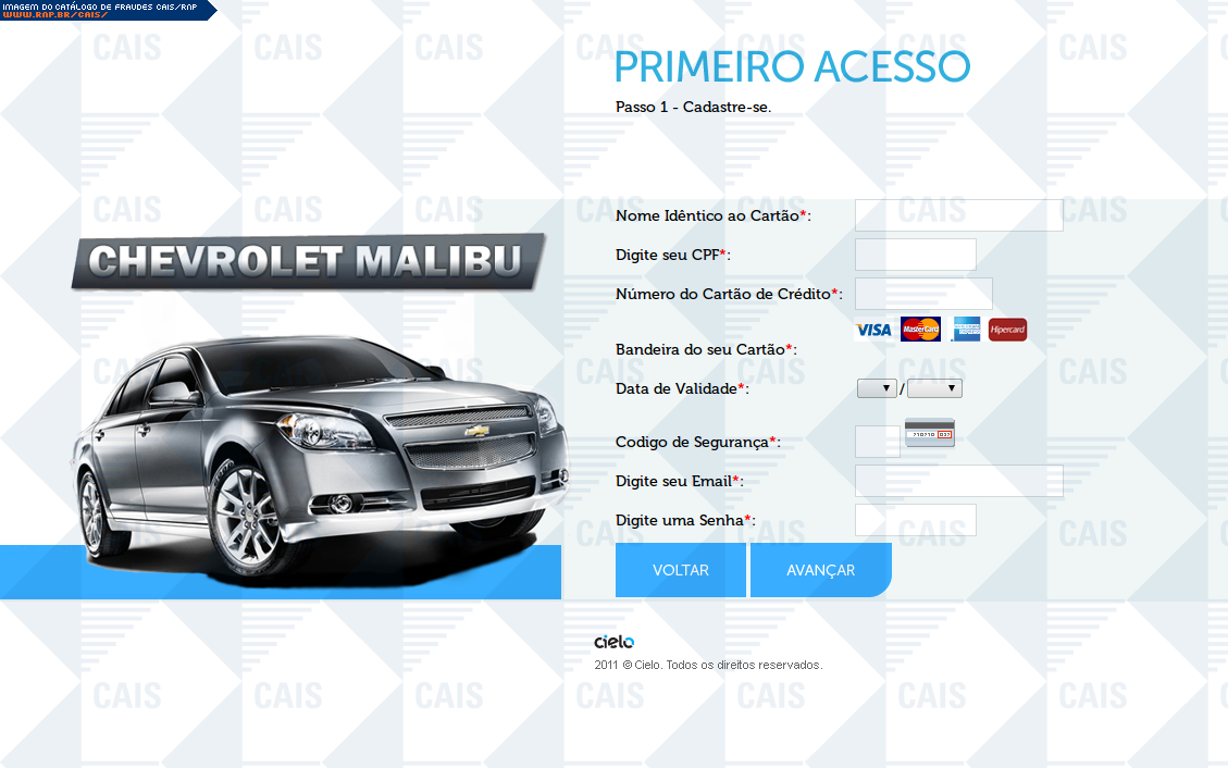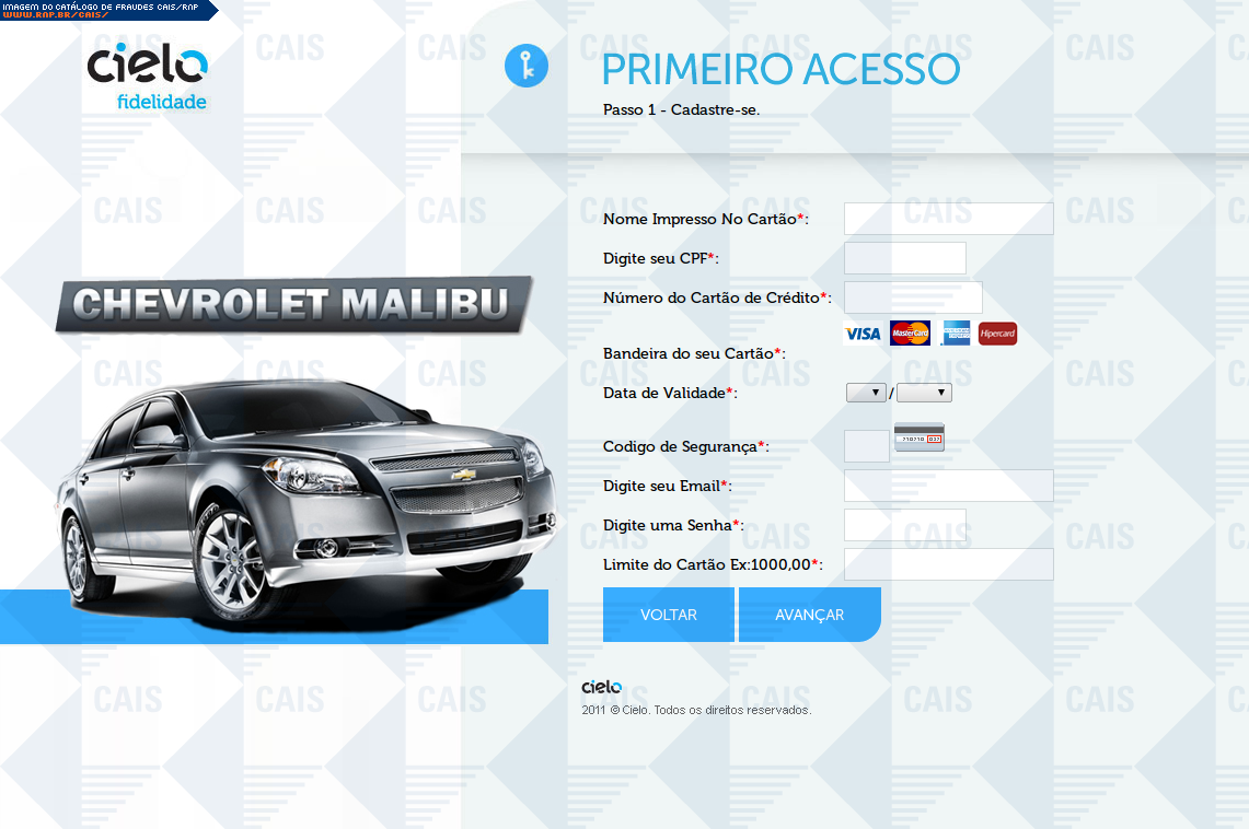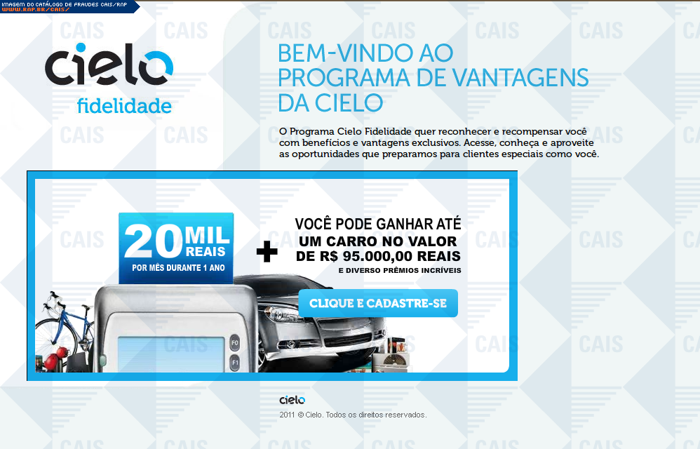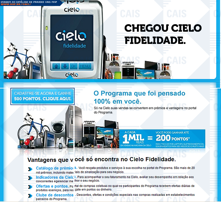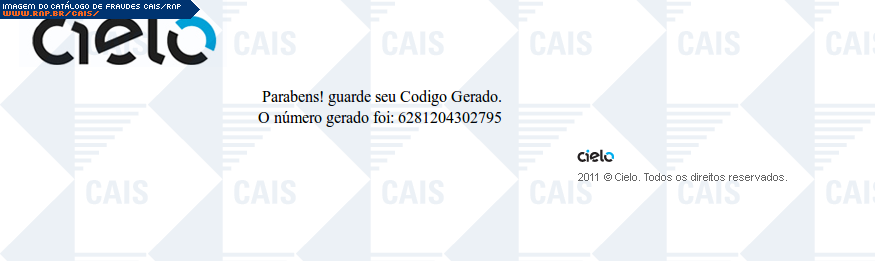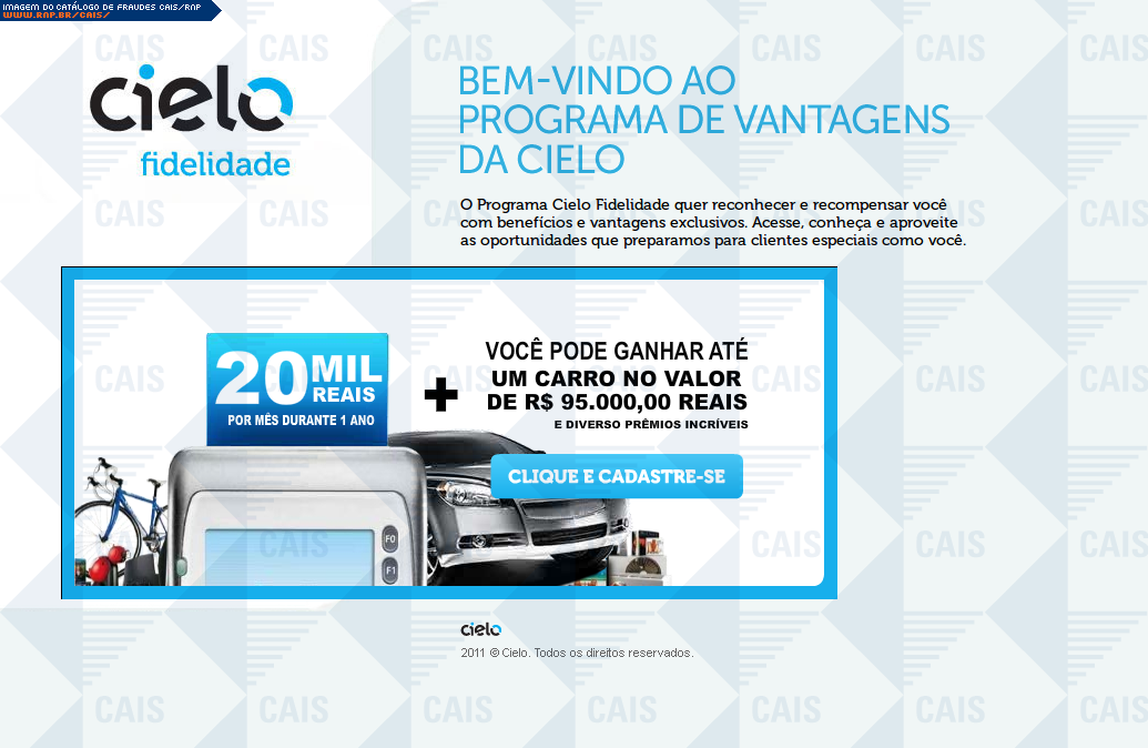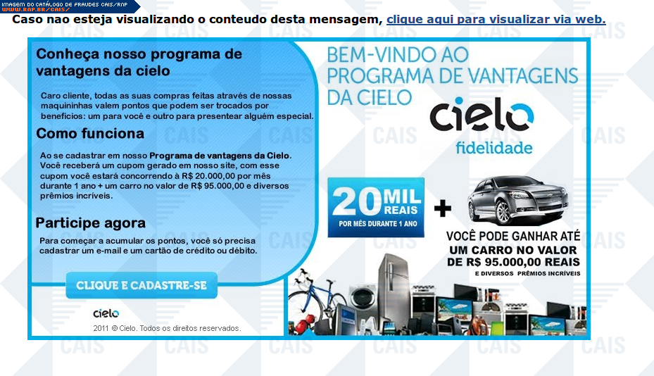 | comentário | A fraude contém um link para o cadastro em uma promoção da Cielo. O link leva a uma página falsa, destinada a coletar dados do cartão de crédito da vítima. Observação: o site falso só aceita números válidos de cartões de crédito. | |