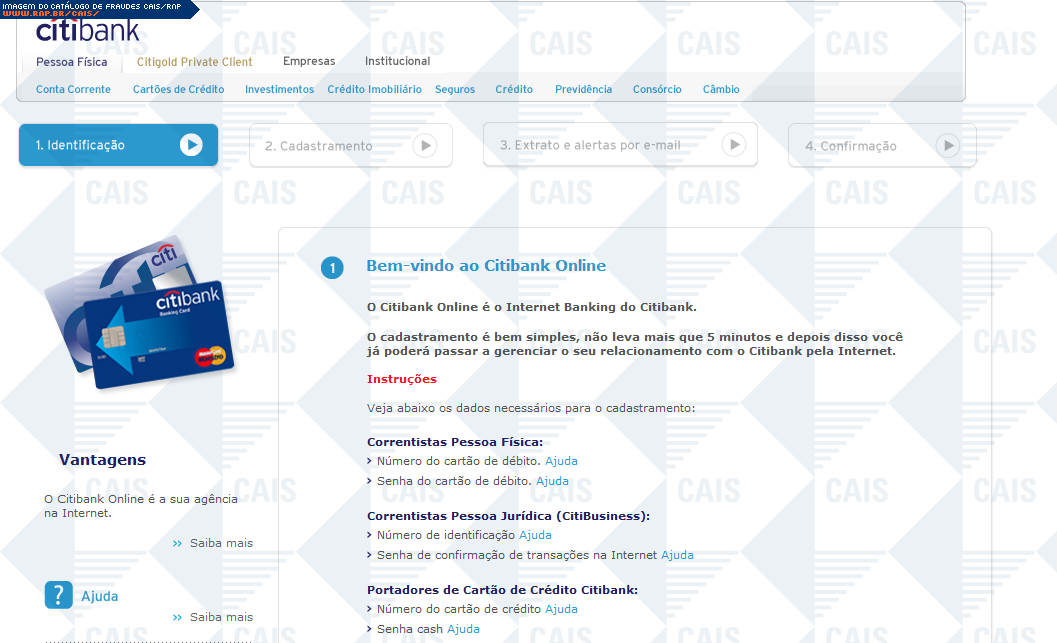 | comentário | Mensagem falsa em nome do Citibank informando sobre o Citibank Online. A mensagem contém um link para o suposto cadastro no serviço. O conteúdo malicioso já havia sido removido no momento da análise. | |