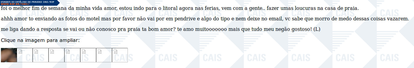 | comentário | A mensagem contém links para fotos que teriam sido tiradas em um motel. O link leva ao arquivo malicioso identificado como Trojan-Banker.Win32.Qhost (Ikarus). | |