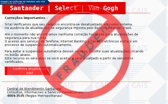 Esta página tem função informativa e educativa. Exibe uma coleção de imagens de phishing scam (fraudes eletrônicas) ou malware (código malicioso) veiculados por meio de spam (e-mail não-solicitado). Trata-se de conteúdo exemplificativo, não exaustivo, uma vez que não é possível contemplar todos os casos de fraudes existentes. Assim, caso você tenha conhecimento de um exemplar que não esteja aqui presente, isto não significa que não seja válido ou real. Inclusive incentivamos que você o envie para análise do CAIS para que, se for o caso, passe a integrar o nosso acervo.