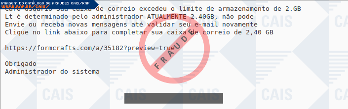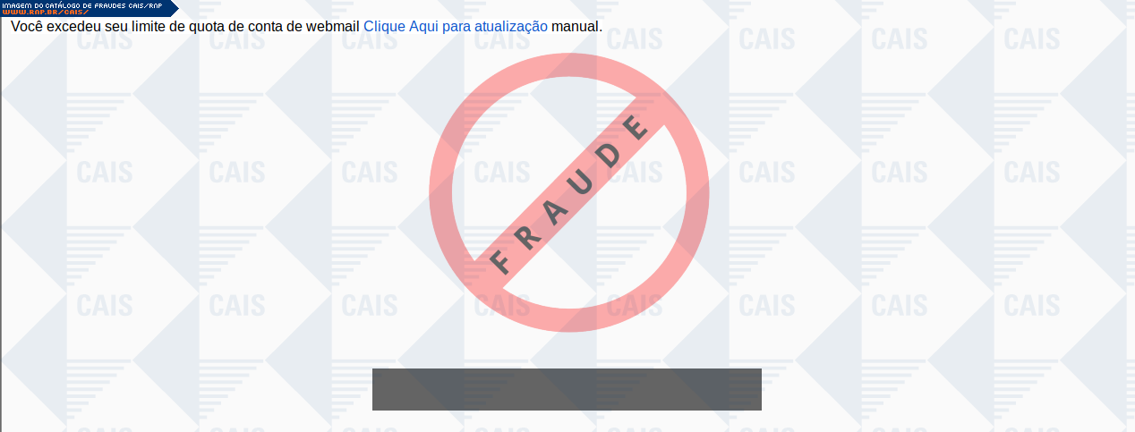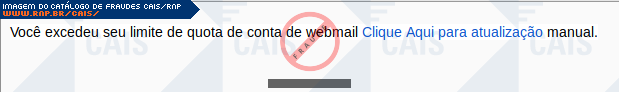 | comentário | O usuário recebe uma mensagem informando que a capacidade de armazenamento de sua conta de e-mail atingiu o limite sendo necessário uma atualização no link disponibilizado, entretanto a página é falsa criada para roubar os dados do e-mail da vítima. | |